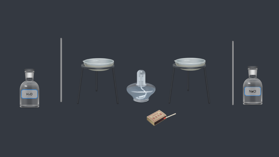 器材:蒸发皿,三脚架,酒精灯,玻璃棒,火柴。